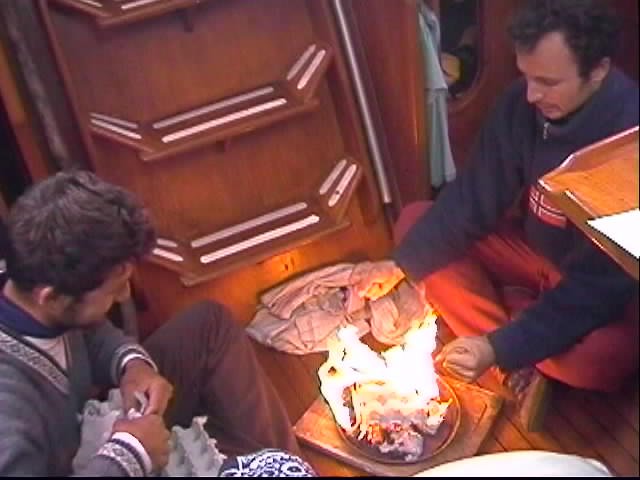 Bloqué dans la caleta Olla par un temps exécrable, nous commencons à avoir vraiment froid...un petit feu est le bienvenu...certes, il y a tellement de fumée après qu'il faut aérer, et perdre toute la chaleur...