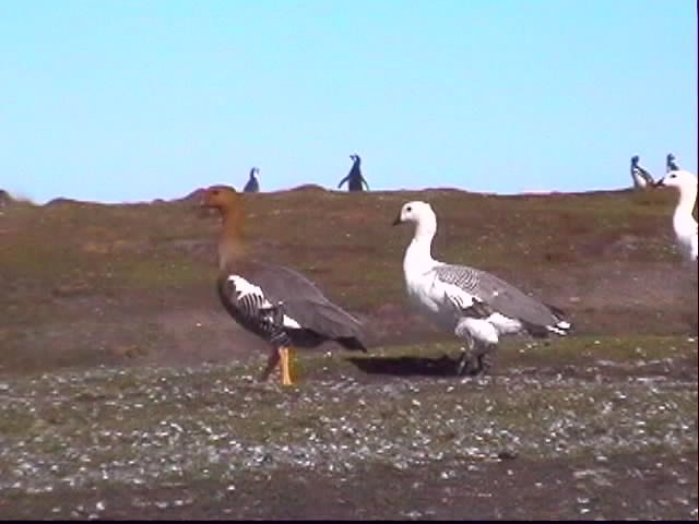 Couple d'oies des Falkland -Upland goose-, espèce très répandue sur l'île. Le mâle est blanc.